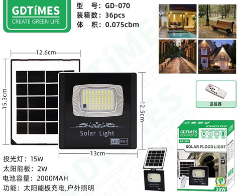 - Lighting configuration: 6V2W solar panel, multi-functional remote control
