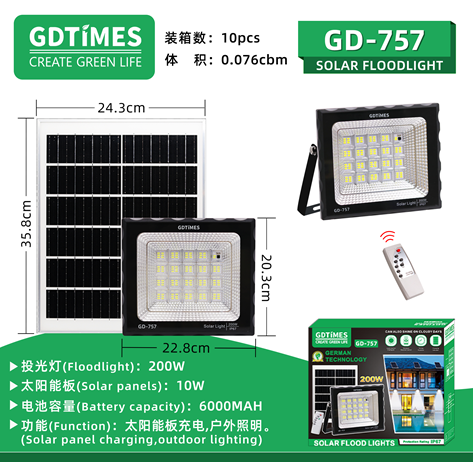 - Lighting configuration: 6V10W solar panel, multi-functional remote control