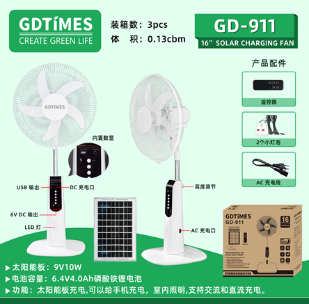- Fan configuration: 9V 10W solar panel, 2 LED bulbs, remote control, AC charging cable