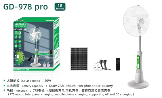- Fan configuration: 18V 20W solar panel, 2 LED bulbs
