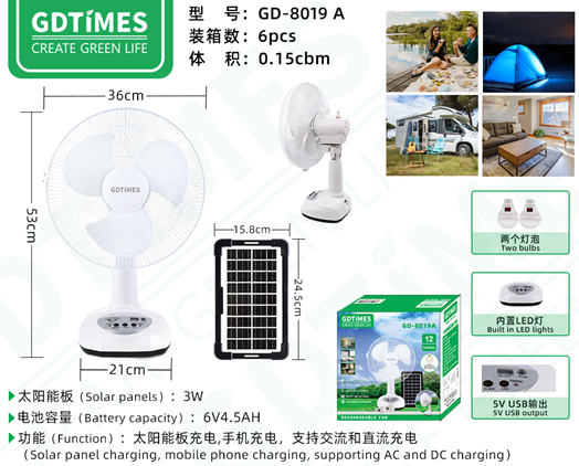 - Fan configuration: 9V 3W solar panel, 2 LED bulbs