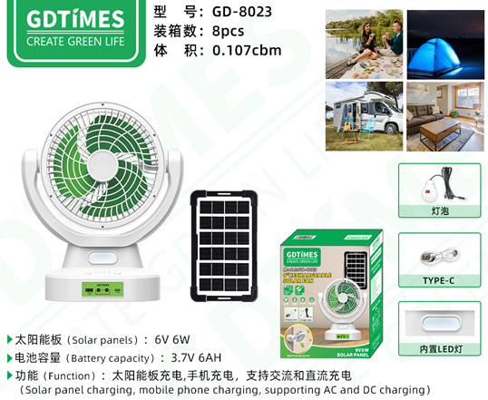6. Fan configuration: Type-C charging cable, 6V 6W solar panel, 1 LED bulb